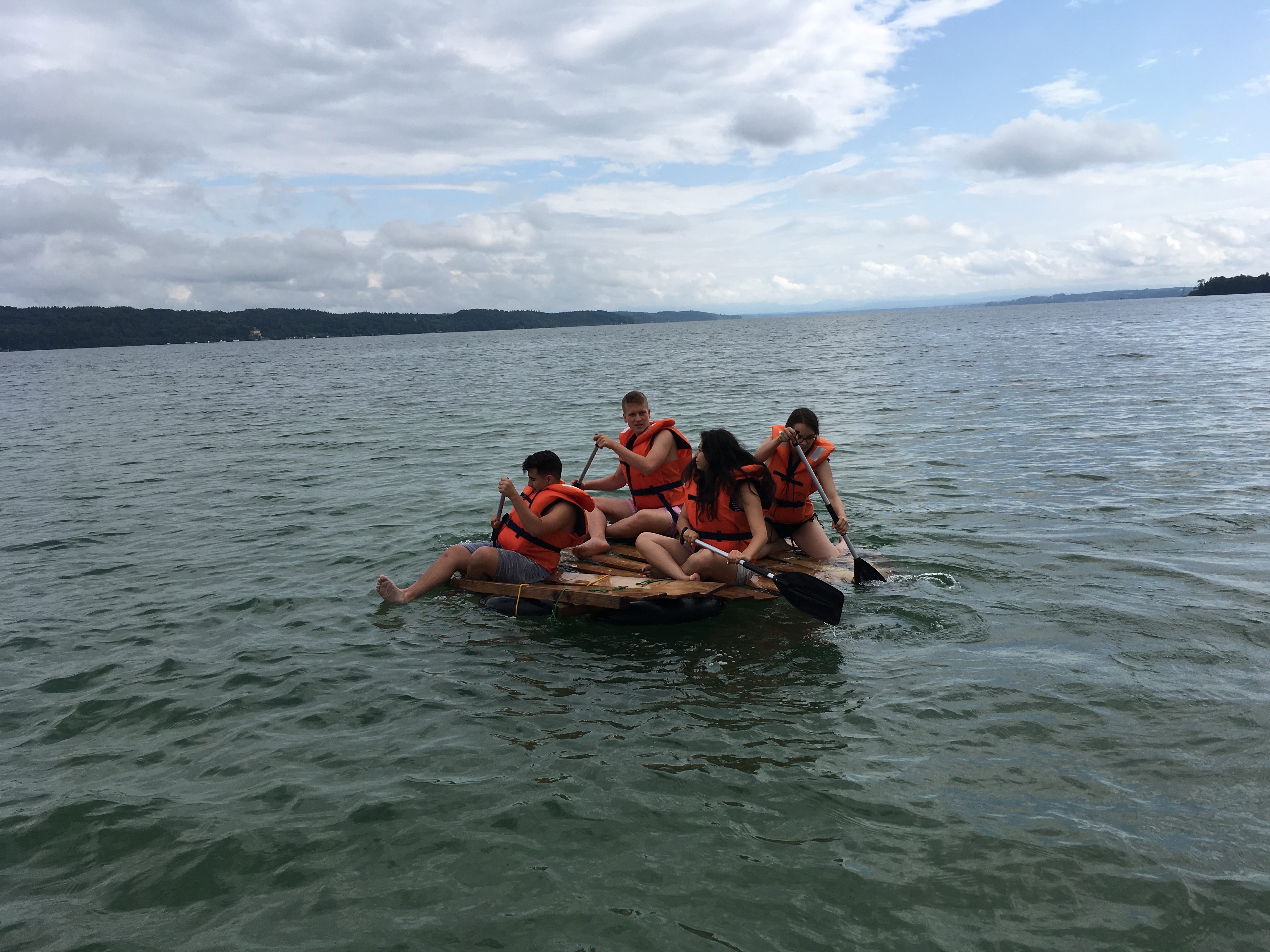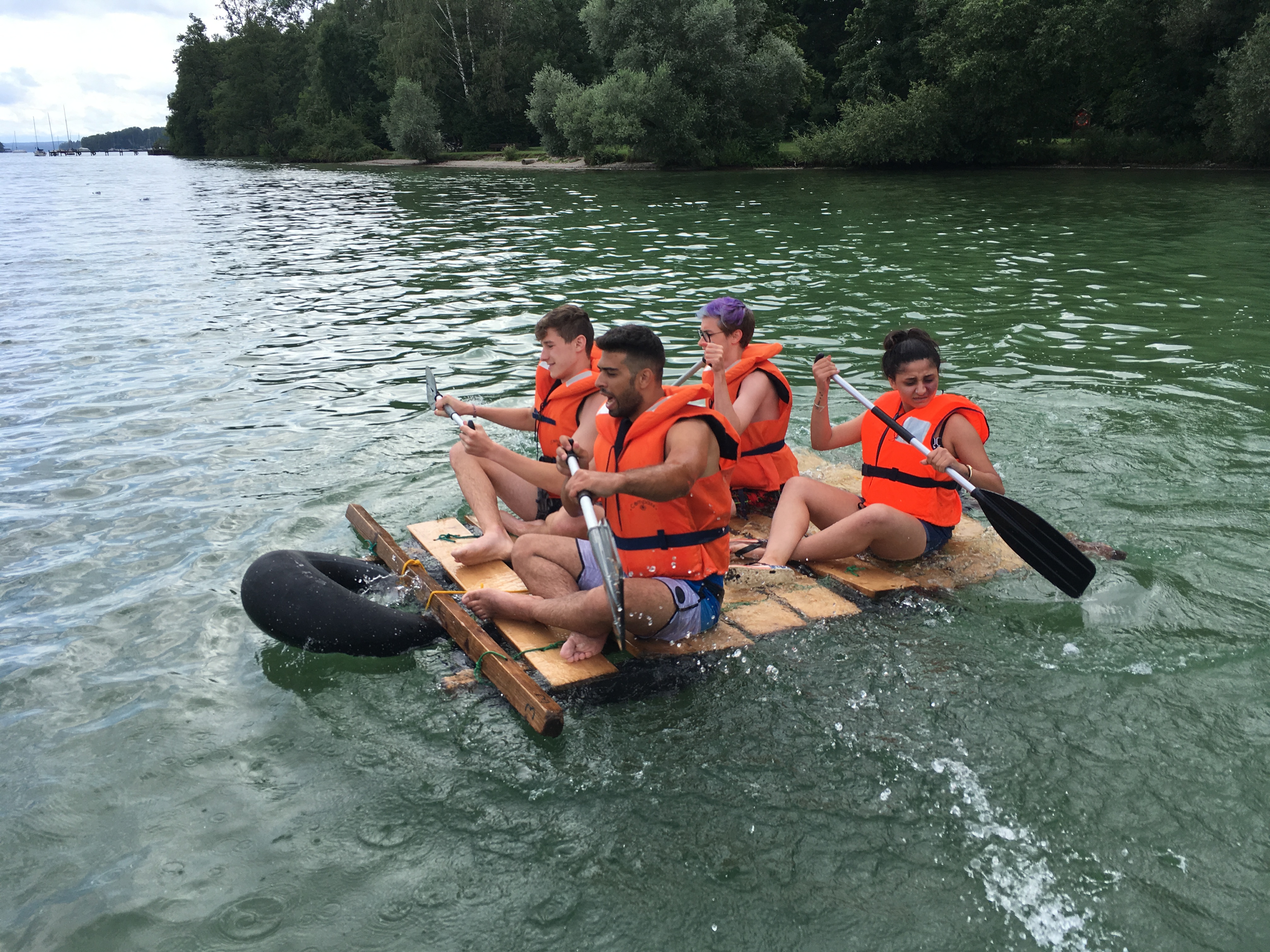 With his help we built 4 very stable and swimmable rafts. They were very stable on the land, but not that stable and „swimable“ anymore as soon as they touched the water. Still each of them could carried 4 people savely through the lake.  The building process was very good for us to also build up teamwork and we all learned how to work together efficiently. We were even able to work all together as a team, when we raced against the clock and tried to pick 18 bottles out of the water in under 10 minutes.