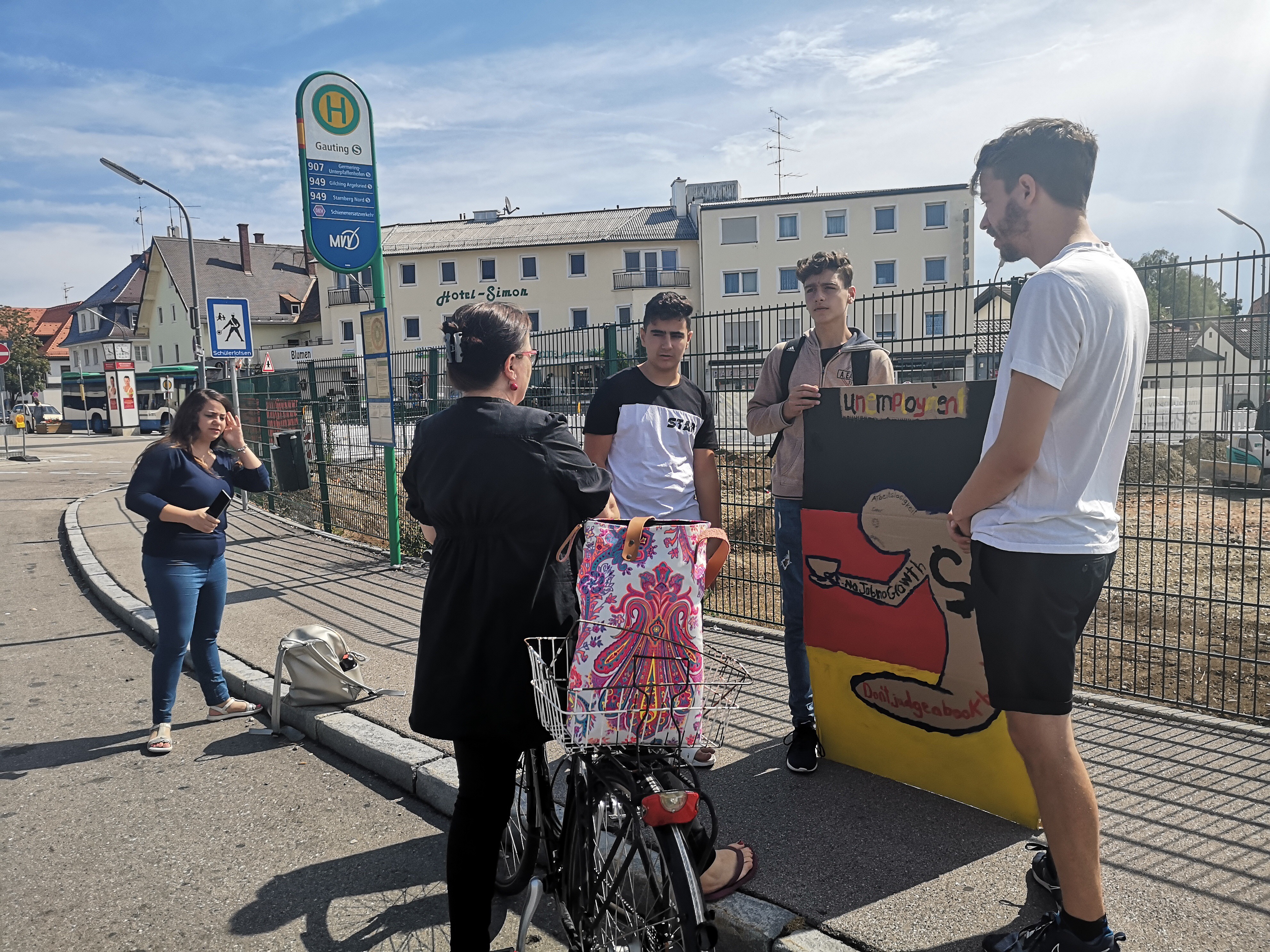On Monday we welcomed a guest that some of us knew from the past of the youth exchange. Anna-Lena, who had been a part of the leading team in the past years, arrived to an art project with us. The very political project started with the visit of a member of the „Fridays For Future“ – movement in Munich, who talked about climate change and the origins of this movement and answered all our questions about global warming and the activism against the destruction of the environment.